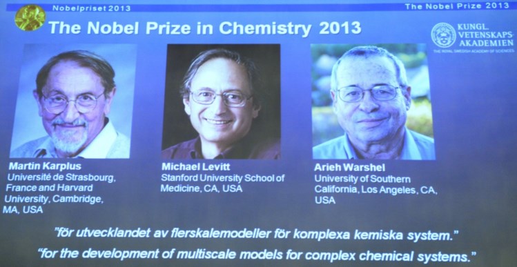 O Prémio Nobel da Química de 2013 foi para Martin Karplus (Universidade de Estrasburgo, França, e Universidade de Harvard, EUA), Michael Levitt (Universidade de Stanford, EUA) e Arieh Warshel (Universidade da Califórnia do Sul, EUA), “pelo desenvolvimento de modelos multiescala para sistemas químicos complexos", anunciou ontem em Estocolmo a Real Academia Sueca das Ciências.